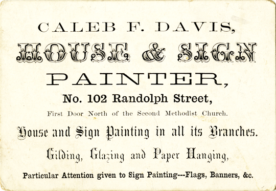 View of a business card for Caleb F. Davis. Printed on front: "Caleb F. Davis, house & sign painter. No. 102 Randolph Street, first door north of the Second Methodist Church. House and sign painting in all its branches. Gilding, glazing and paper hanging. Particular attention given to sign painting -- flags, banner, & c."