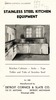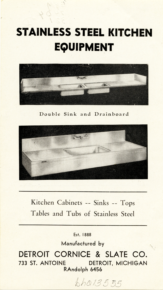 Brochure advertising stainless steel kitchen equipment manufactured by the Detroit Cornice & Slate Co., with illustrations of a kitchen and sinks. Printed on front: "Stainless steel kitchen equipment. Kitchen cabinets, sinks, tops, tables and tubs of stainless steel. Est. 1888. Manufactured by Detroit Cornice & Slate Co. 733 St. Antoine. Detroit, Michigan. Randolph 6456."