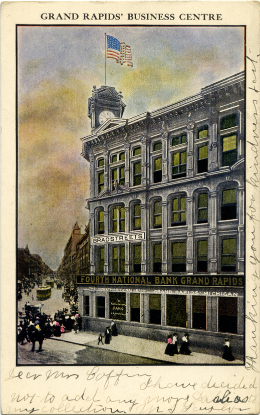 View of the Fourth National Bank in Grand Rapids, Michigan. Printed on front: "Grand Rapids' business centre." Handwritten on front: "Dear Mrs. Coffin, I have decided not to add any more dahlias to my collection [undecipherable]. Thanking you for kindness [undecipherable]." Printed on back: "Dickinson Bros., G.R. Mich."