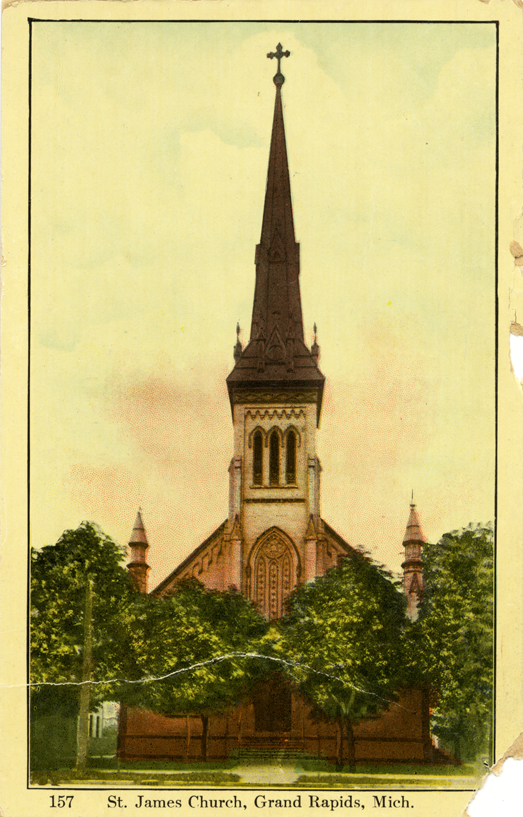 View of St. James Catholic Church in Grand Rapids, Michigan. Printed on front: "157. St. James Church, Grand Rapids, Mich."