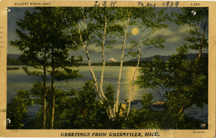 Nighttime view of a lake in Greenville, Michigan. Printed on front: "Silvery moonlight. Greetings from Greenville, Mich." Handwritten on front: "L.S.K. Mar. 1939." Printed on back: "C.T. Moonlight scenes, 10 subjects. Genuine Curteich-Chicago 'C.T. Art-Colortone' post card (reg. U.S. Pat. Off.)" Handwritten on back: "Arrived safely. Dad met us in Ionia and we are having a fine time. Mrs. Kelpien." Card is postmarked May 24, 1939.