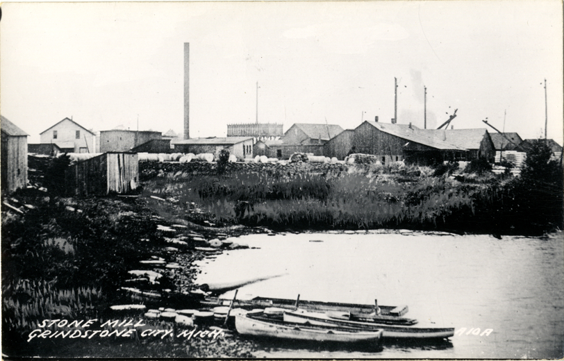 View of a stone mill at Grindstone City, Michigan. Printed on front: "Stone mill, Grindstone City, Mich." Printed on back: "All rights reserved. The L.L. Cook Co., Milwaukee."