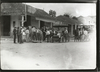 Automobile and horse-drawn wagon in front of Mission-style building