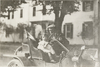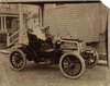 Girl posing behind wheel of press automobile, 1908 Glidden Tour