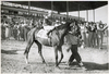 Jockey riding horse near stable, Michigan Racing Association racetrack