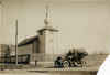 - Motorists in 1905 White Steamer automobile in front of Orthodox church building