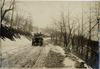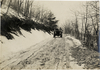 Motorists in 1905 White Steamer automobile traveling on snow-covered mountain road
