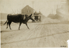 Motorists in 1905 White Steamer automobile waiting for cow to cross road