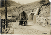Motorists in 1905 White Steamer automobile traveling under railroad bridge