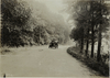 Motorists in 1906 White Steamer automobile traveling downhill on dirt road, New York
