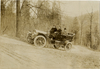 Motorists in 1907 Peerless automobile traveling on road through woods