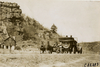 - Motorists in E-M-F automobile passing horse-drawn wagon in front of rock formations, 1909 Glidden pathfinding expedition