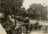Soldiers on horseback and crowd waiting at railroad station, Custer memorial celebration