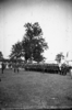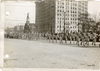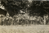 Soldiers on horseback, motorists in automobiles and crowd waiting at railroad station, Custer memorial celebration