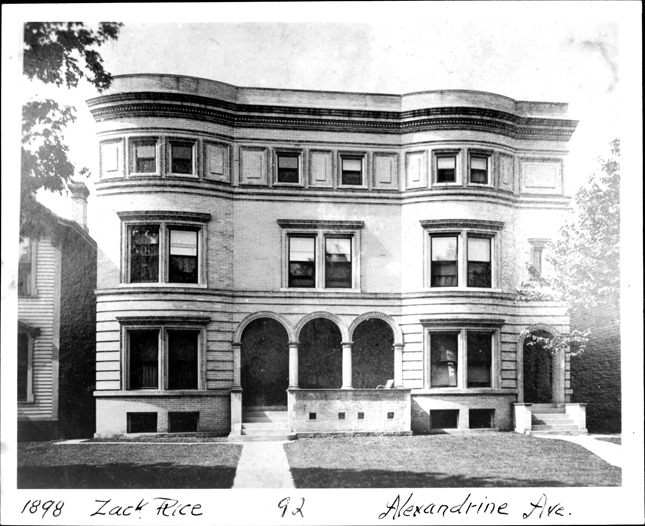 Exterior view of the front of the Rice brick and stone home. Written on photo back: "Double residence, Zack Rice, Detroit res., 3211 Alexander Ave. E., 1898." Stamped on photo back: "Office of Mason & Rice, architects, 80 Griswold St., Detroit, Mich."