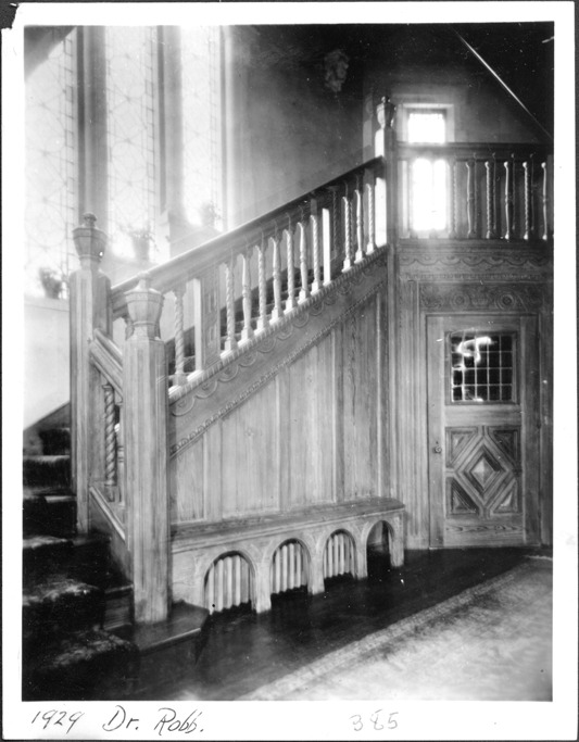 Interior view of wooden staircase and stained glass window in the Robb residence. Written on photo front: "1929, Dr. Robb, #385."
