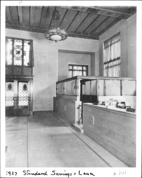 Favorite this☆ Standard Savings and Loan interior Description: Interior view of Standard Savings & Loan with teller stations and office enclosure. Written on photo front: "1927, Standard Savings & Loan, 291." Details Resource ID: MR0133 Creator: George D. Mason & Co. Subject: Bank buildings--Michigan--Detroit Photographic prints Date Issued: 1927 Format: 1 photographic print ; 4.25 x 3.25 in. Member of: Burton Historical Collection Filing Location: D/Architecture-Mason & Rice Colln. Rights: Physical rights are retained by DPL. Copyright is retained in accordance with U.S. copyright laws.