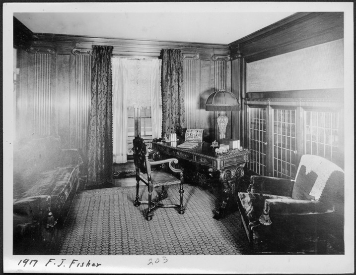 Office with ornate desk and built-in, glass-doored bookcases in the Fisher residence. Written on photo front: "1917, F.J. Fisher, 203."