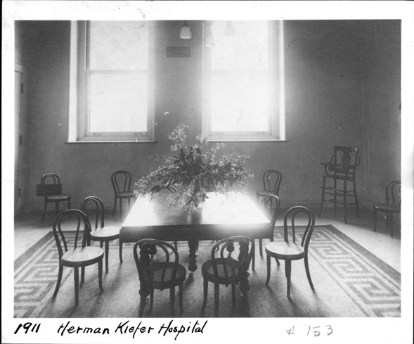 Favorite this☆ Herman Kiefer Hospital meeting room Description: Interior view of a meeting room at Herman Kiefer Hospital, with chairs around a large table. Written on photo front: "1911, Herman Keifer Hospital, 153." Details Resource ID: MR0188 Creator: George D. Mason & Co. Subject: Hospital architecture--Michigan--Detroit Hospitals--Michigan--Detroit Conference rooms--Michigan--Detroit Photographic prints Date Issued: 1911 Format: 1 photographic print ; 3.25 x 4 in. Member of: Burton Historical Collection Filing Location: D/Architecture-Mason & Rice Colln. Rights: Physical rights are retained by DPL. Copyright is retained in accordance with U.S. copyright laws.