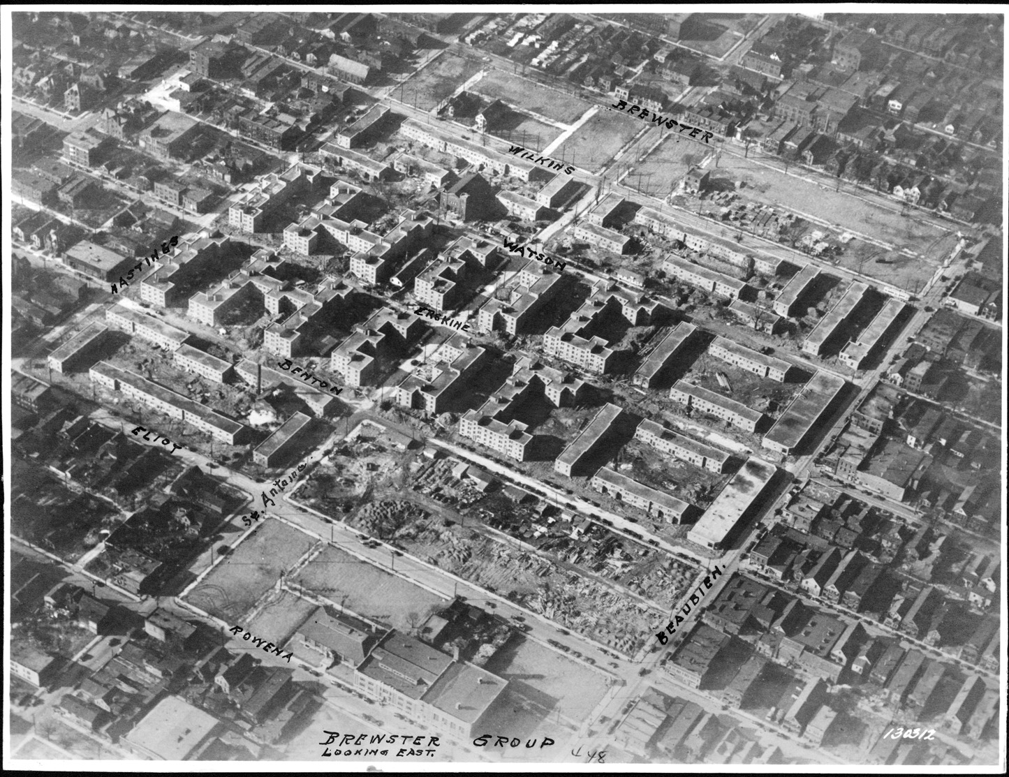 Aerial view of Brewster Housing Group, street names are hand labeled. Written on photo front: "Brewster Group Looking East, 448, 130312."