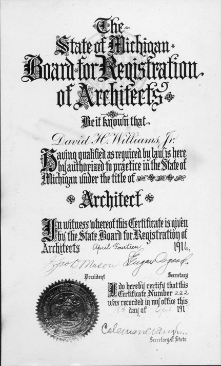 Cerfiticate, State of Michigan Board for Registration of Architects for David H. Williams, Jr. "