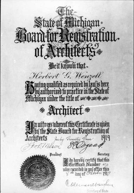 Certificate, State of Mich. Board for Registration of Architects for Herbert G. Wenzell.