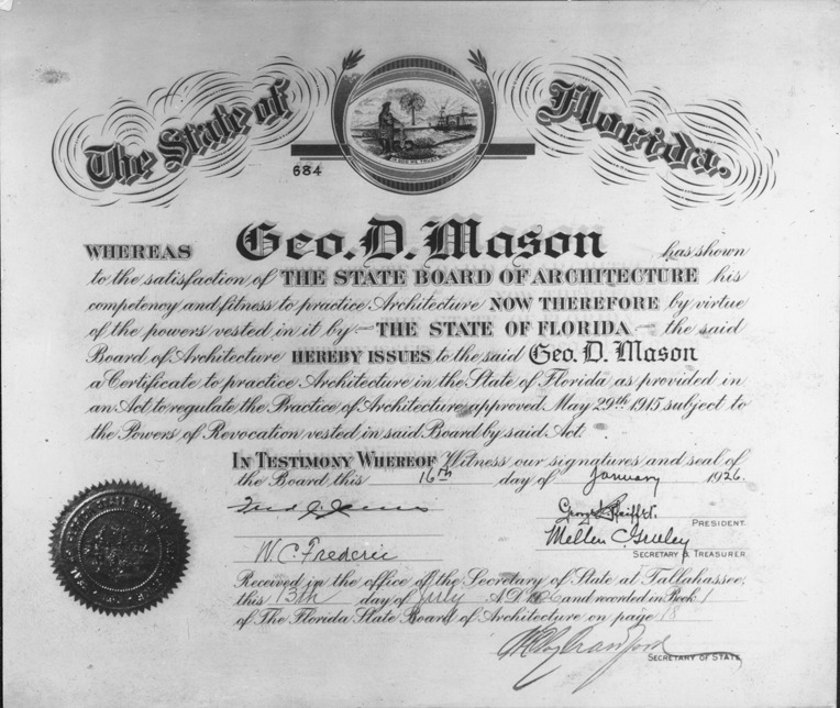 Favorite this☆ Florida architect's certificate for George D. Mason Description: Florida State Board of Architecture certificate for George D. Mason. Details Resource ID: MR0250 Creator: George D. Mason & Co. Subject: Architects--Certification Photographic prints Date Issued: 1926 Format: 1 photographic print ; 4.25 x 5 in. Member of: Burton Historical Collection Filing Location: D/Architecture-Mason & Rice Colln. Rights: Physical rights are retained by DPL. Copyright is retained in accordance with U.S. copyright laws.