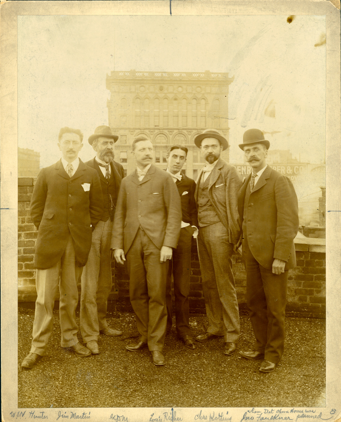 Mason & Rice Detroit Opera House project staff. Written on photo front: "When Det. Opera House was planned, W.E.N. Hunter, Jim Martin, G.D.M., Louis Risher, Chas. Kotting, Jno. Faulkner, 8." Written on photo back: "Det. Opera House Crew 1898, on roof of 80 Griswold St."