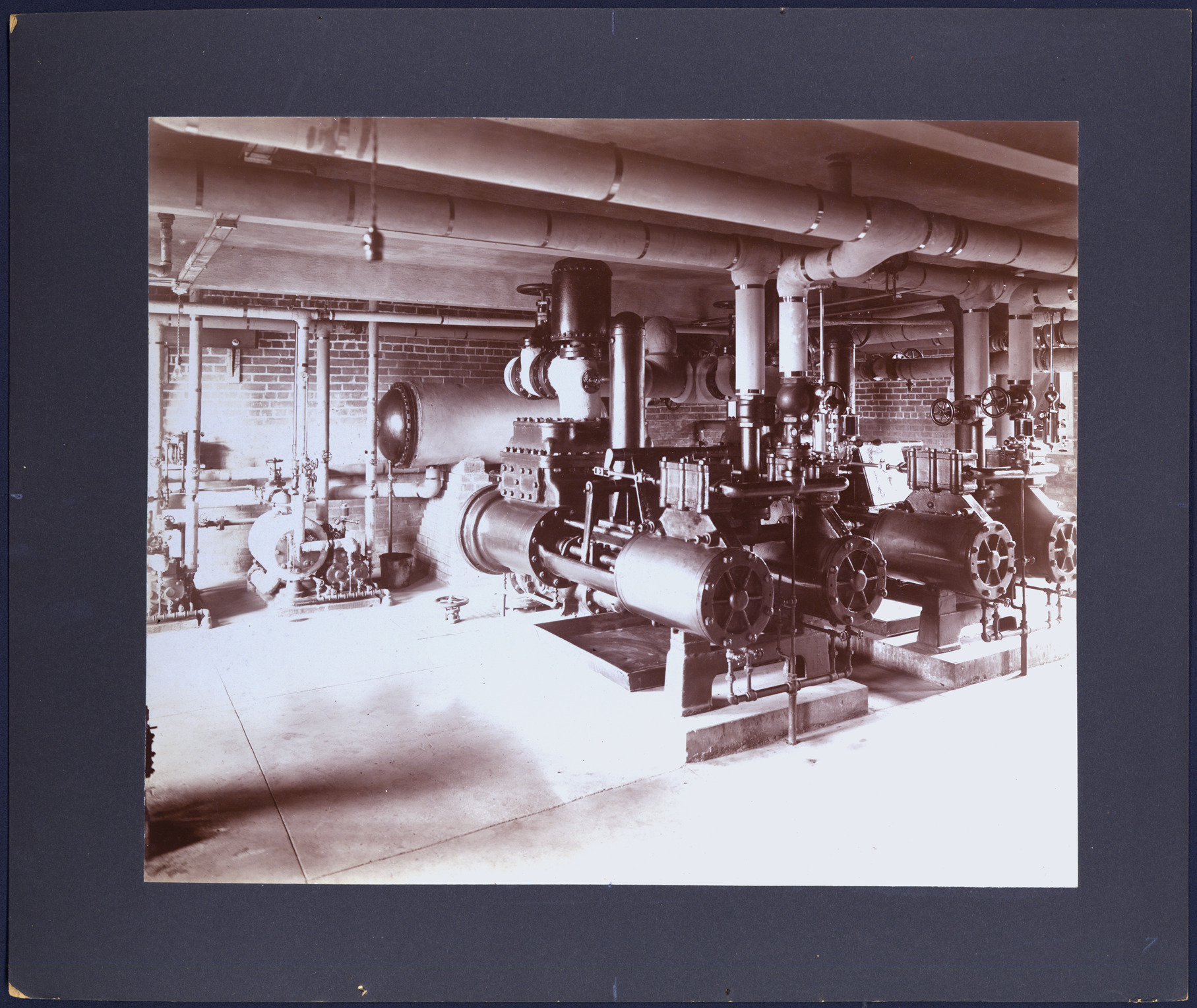 Interior of the Belle Isle Aquarium pump room. Written on photo back: "The Baker Art Studio, portraits and commercial photographers, 35-37-39 Monroe Ave., Detroit, Mich."