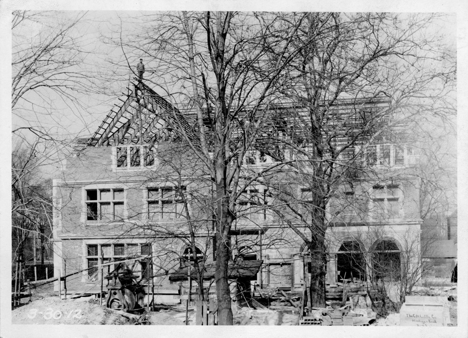Construction of the Bowen residence, man perched on roof frame. Written on photo front: "3-30-12."
