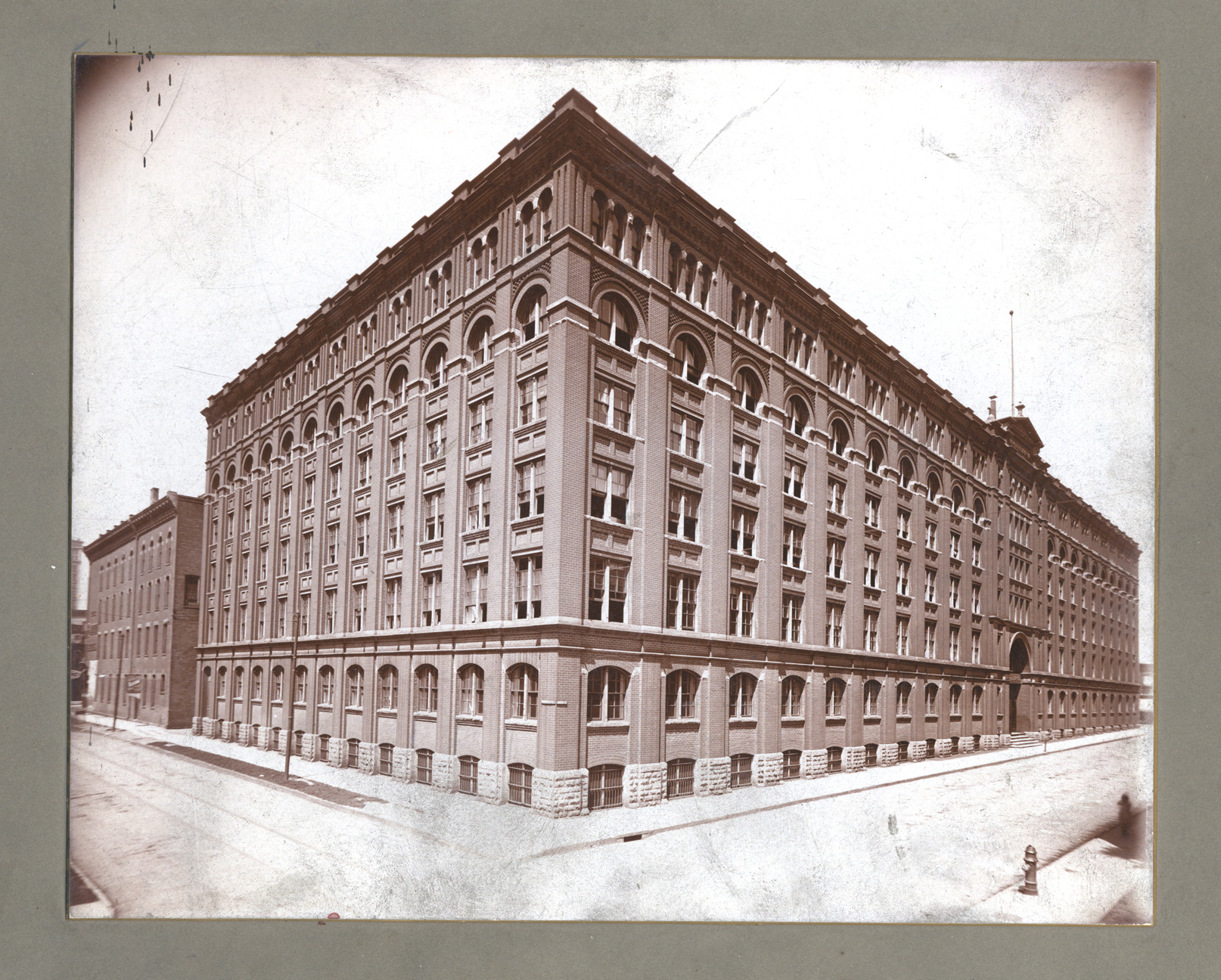 Exterior of the D.M. Ferry Company. Stamped on mat board front: "Detroit Photographic Co." Written on photo back: "D.M. Ferry Seed Co., Warehouse, 1889." Photo is mounted on hard board, then mounted to mat board. Verso of mat board has sketches in pencil.