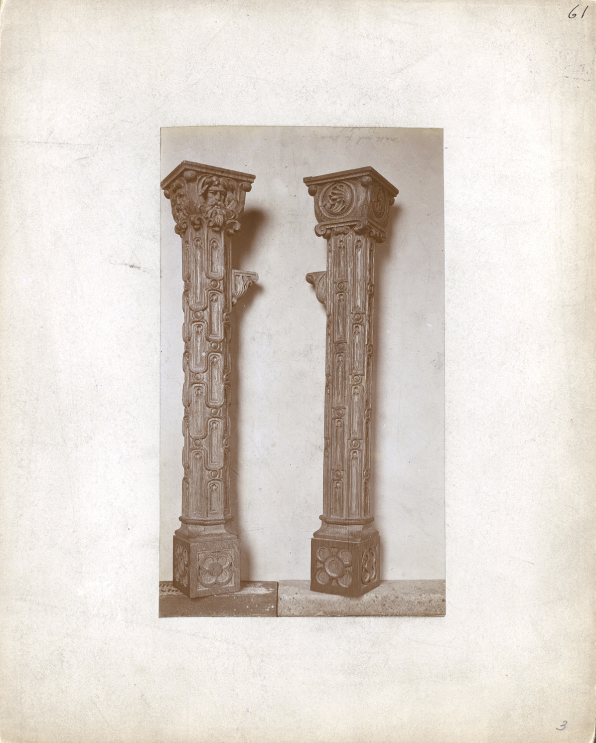 Carved wooden legs for furniture in the First Presbyterian Church. Written on photo front: "Marble work for (illegible)." Written on photo front: "61." Written on photo back: "Carved table legs for pulpit furniture in First Presbyterian Church-Detroit." Stamped on photo back: "Office of Mason & Rice, architects." Back of photo has sketches in pencil.