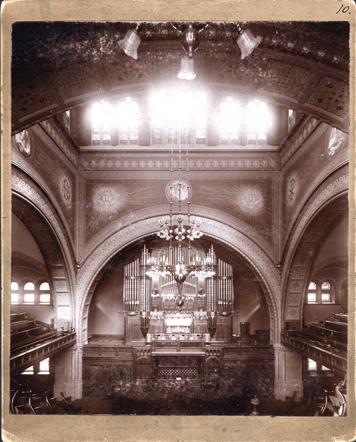 Interior of the First Presbyterian Church showing organ and part of balcony and nave. Written on photo front: "10." Written on photo back: "Interior First Presby.-Church Detroit-First Presbyterian Church organ." Stamped on photo back: "George D. Mason, architect" and "Office of Mason & Rice, architects."