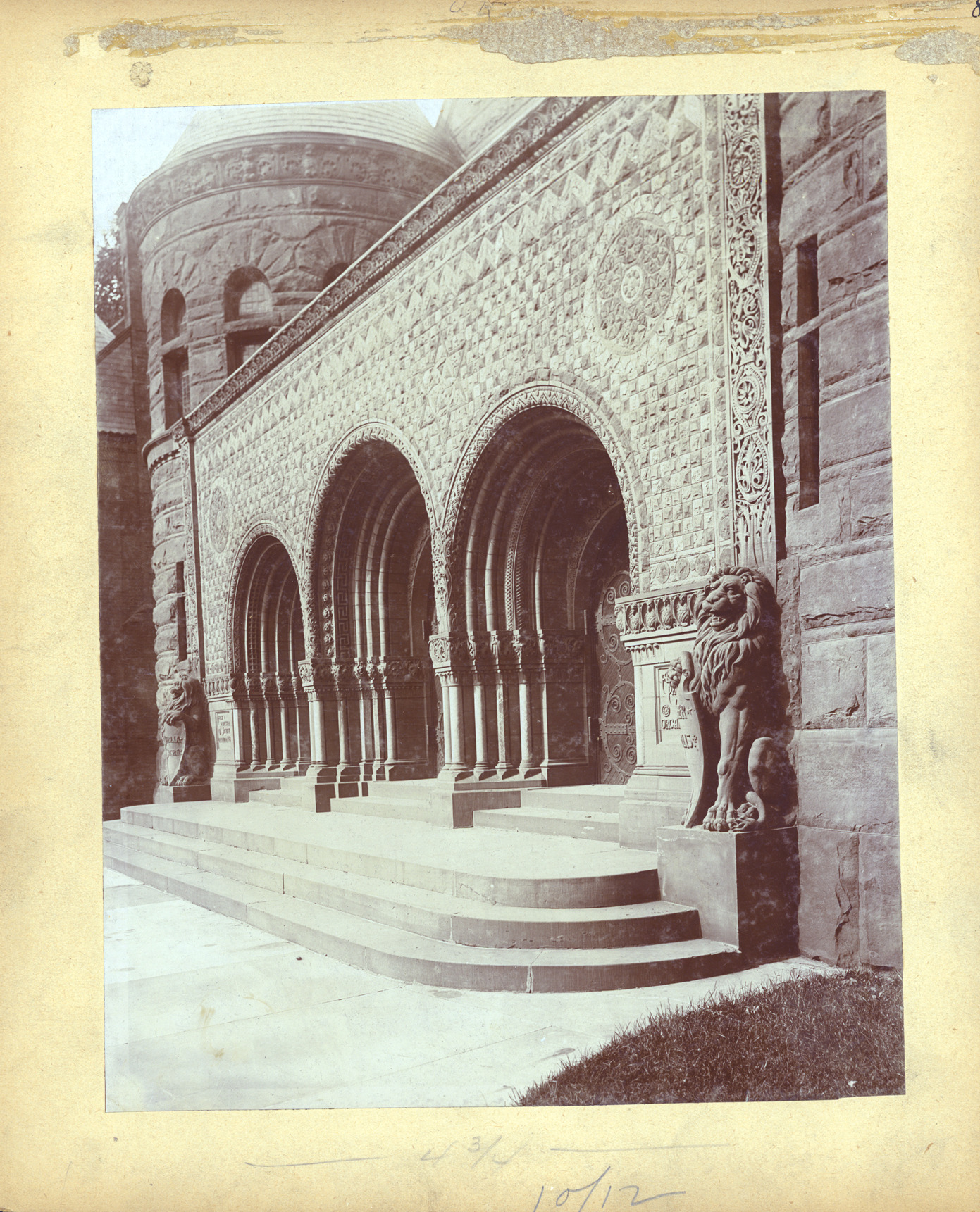 Favorite this☆ First Presbyterian Church Description: Entrance of the First Presbyterian Church showing arched entrance, stonework and stone lions. Written on photo front: "4 3/4 10/12." Written on photo back: "Detail of front entrance-First Presby. Church-Detroit." Details Resource ID: MR0428 Creator: George D. Mason & Co. Subject: First Presbyterian Church (Detroit, Mich.) Presbyterian church buildings--Michigan--Detroit Arches--Michigan--Detroit Stone carving--Michigan--Detroit Photographic prints Date Issued: 1889 (year approximate) Format: 1 photographic print mounted on mat board ; image 9.5 x 7.5 in. Member of: Burton Historical Collection Filing Location: D/Architecture-Mason & Rice Colln.-First Presbyterian Church Rights: Physical rights are retained by DPL. Copyright is retained in accordance with U.S. copyright laws.