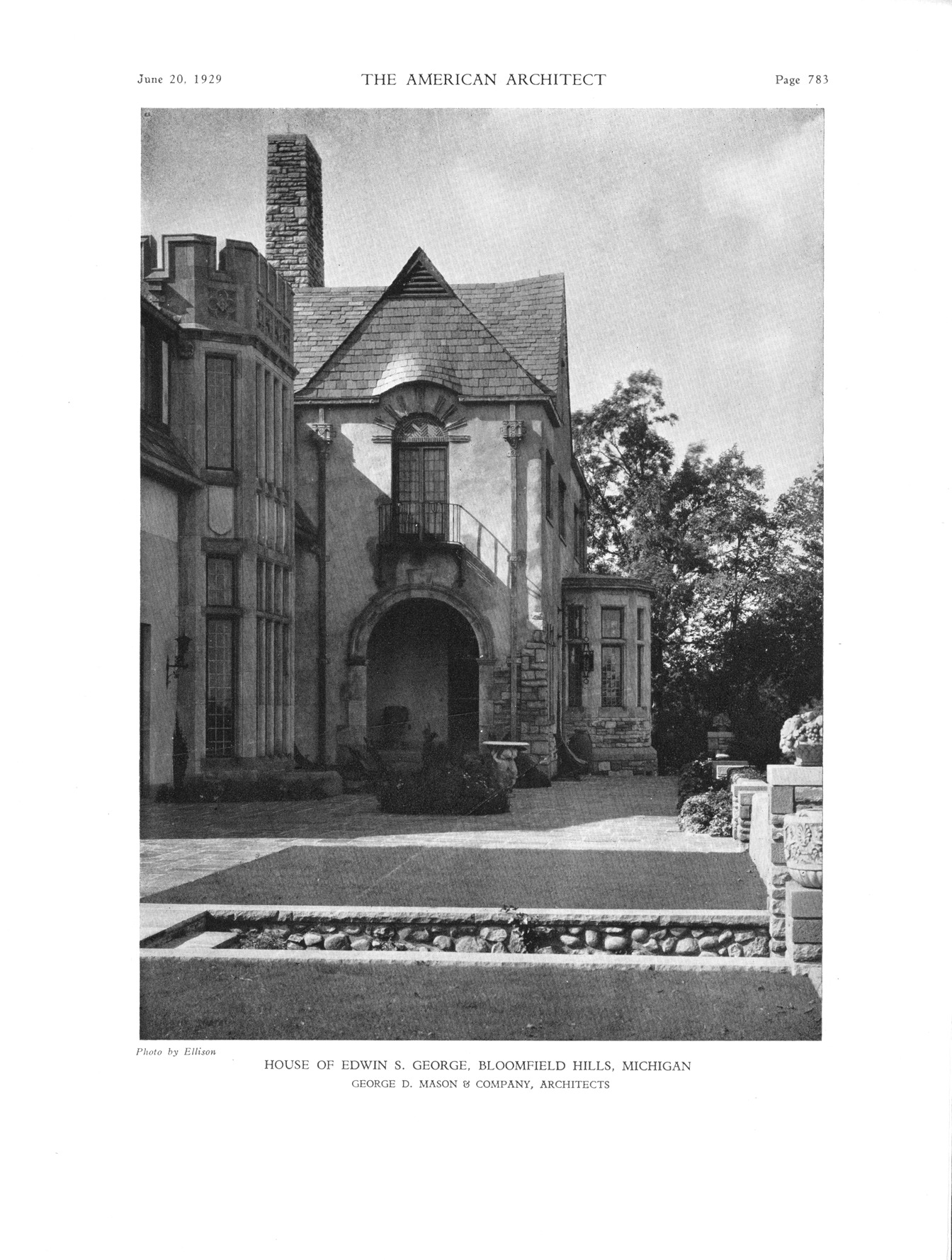 Favorite this☆ Edwin S. George residence Description: Exterior of the Edwin S. George residence. Written on photo front: "June 20, 1929, page 783-The American Architect-House of Edwin S. George, Bloomfield Hills, Michigan, George D. Mason & Company, architects- photo by Ellison." Details Resource ID: MR0458 Creator: George D. Mason & Co. Ellison, Thomas Subject: George, Edwin S., 1873-1951--Homes and haunts--Michigan--Bloomfield Hills Dwellings--Michigan--Bloomfield Hills Photographers--Michigan--Detroit Photographic prints Date Issued: 1929-07-20 Format: 1 photographic print ; 12 x 9 in. Member of: Burton Historical Collection Filing Location: D/Architecture-Mason & Rice Colln.-Edwin S. George residence Rights: Physical rights are retained by DPL. Copyright is retained in accordance with U.S. copyright laws.