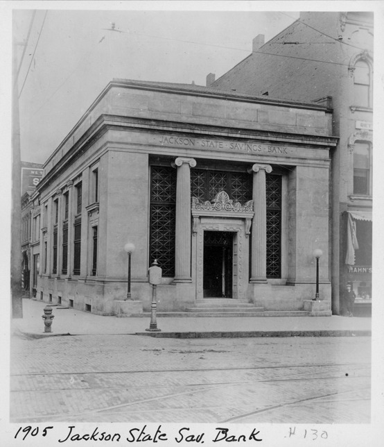 Favorite this☆ Jackson State Savings Bank Description: Exterior of the Jackson State Savings Bank. Written on photo front: "1905, Jackson State Sav. Bank, 130." Details Resource ID: MR0460 Creator: George D. Mason & Co. Subject: Bank buildings--Michigan--Jackson Photographic prints Date Issued: 1905 Format: 1 photographic print ; 4.25 x 3.75 in. Member of: Burton Historical Collection Filing Location: D/Architecture-Mason & Rice Colln.-Jackson State Bank, Jackson, MI Rights: Physical rights are retained by DPL. Copyright is retained in accordance with U.S. copyright laws.