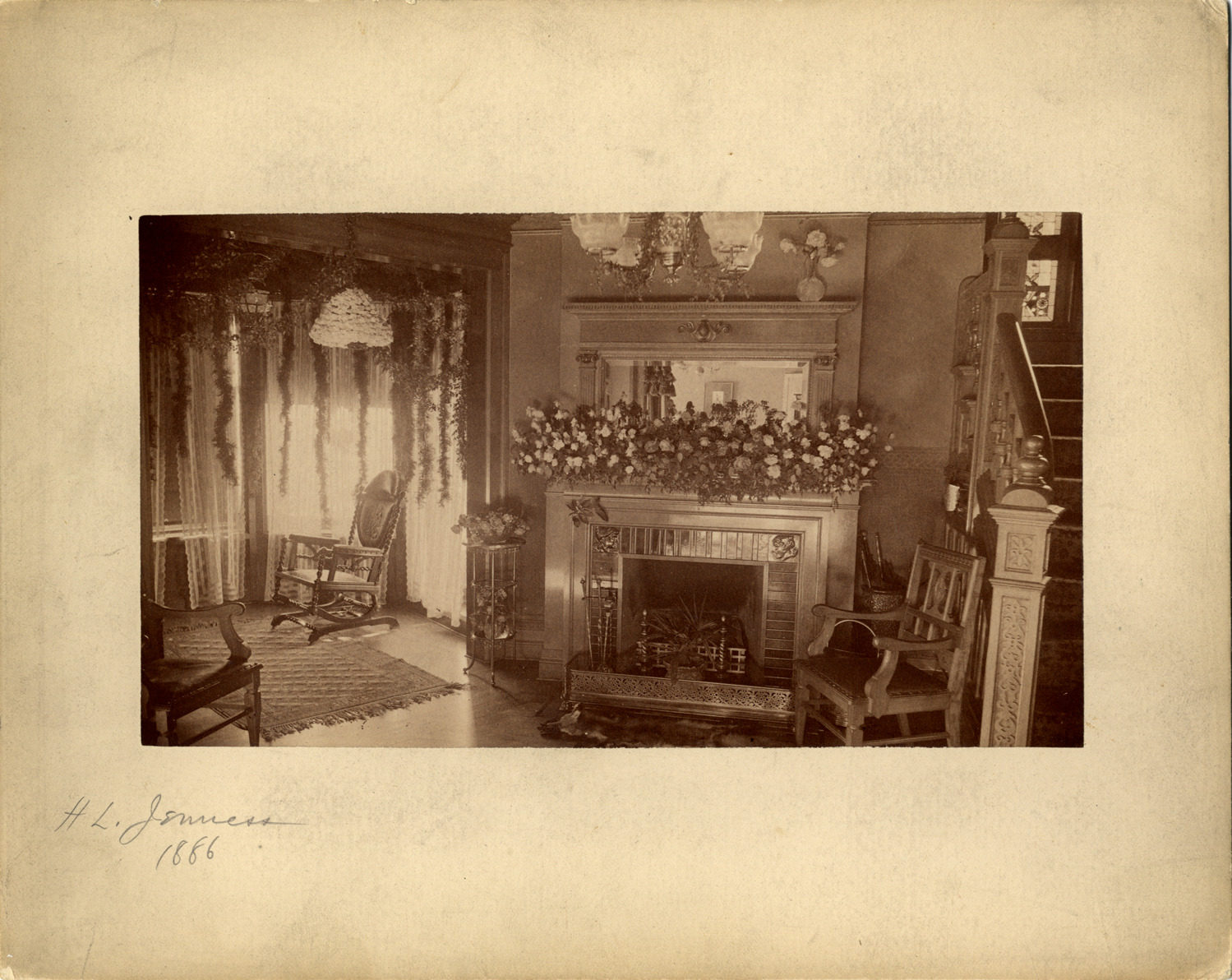 View of the living room of the Henry Leland Jenness house, possibly located at 39 Rowena Street in Detroit, Michigan. Room contains fireplace and chairs; staircase partially visible on right. Handwritten on front: "H.L. Jenness, 1886." Handwritten on back: "Interior-H.L. Jenness residence."