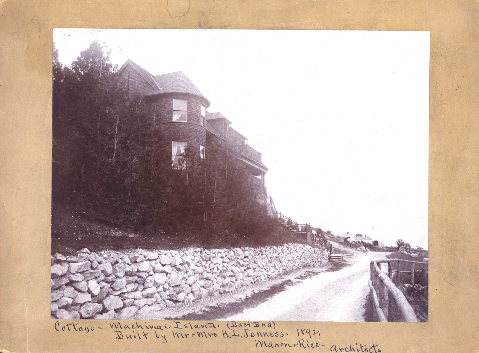 Favorite this☆ H.L. Jenness residence exterior Description: Exterior of cottage of H.L. Jenness (Henry Leland Jenness?). Written on photo front: "Cottage-Mackinac Island, (East End) 1892, Built by Mr. & Mrs. H.L. Jenness-Mason & Rice, architects." Written on photo back: "H.L. Jenness residence, Mackinac Is." Details Resource ID: MR0469 Creator: George D. Mason & Co. Subject: Dwellings--Michigan--Mackinac Island Architecture, Domestic--Shingle style--Michigan--Mackinac Island Mackinac Island (Mich.) Albumen prints Photographic prints Date Issued: 1892 Format: 1 photographic print mounted on mat board ; image 6.75 x 8.75 in. Member of: Burton Historical Collection Filing Location: D/Architecture-Mason & Rice Colln.-H.L. Jenness residence Rights: Physical rights are retained by DPL. Copyright is retained in accordance with U.S. copyright laws.