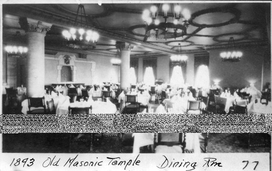 Dining room at the old Masonic Temple. Written on photo front: "1893, Old Masonic Temple, Dining Rm."