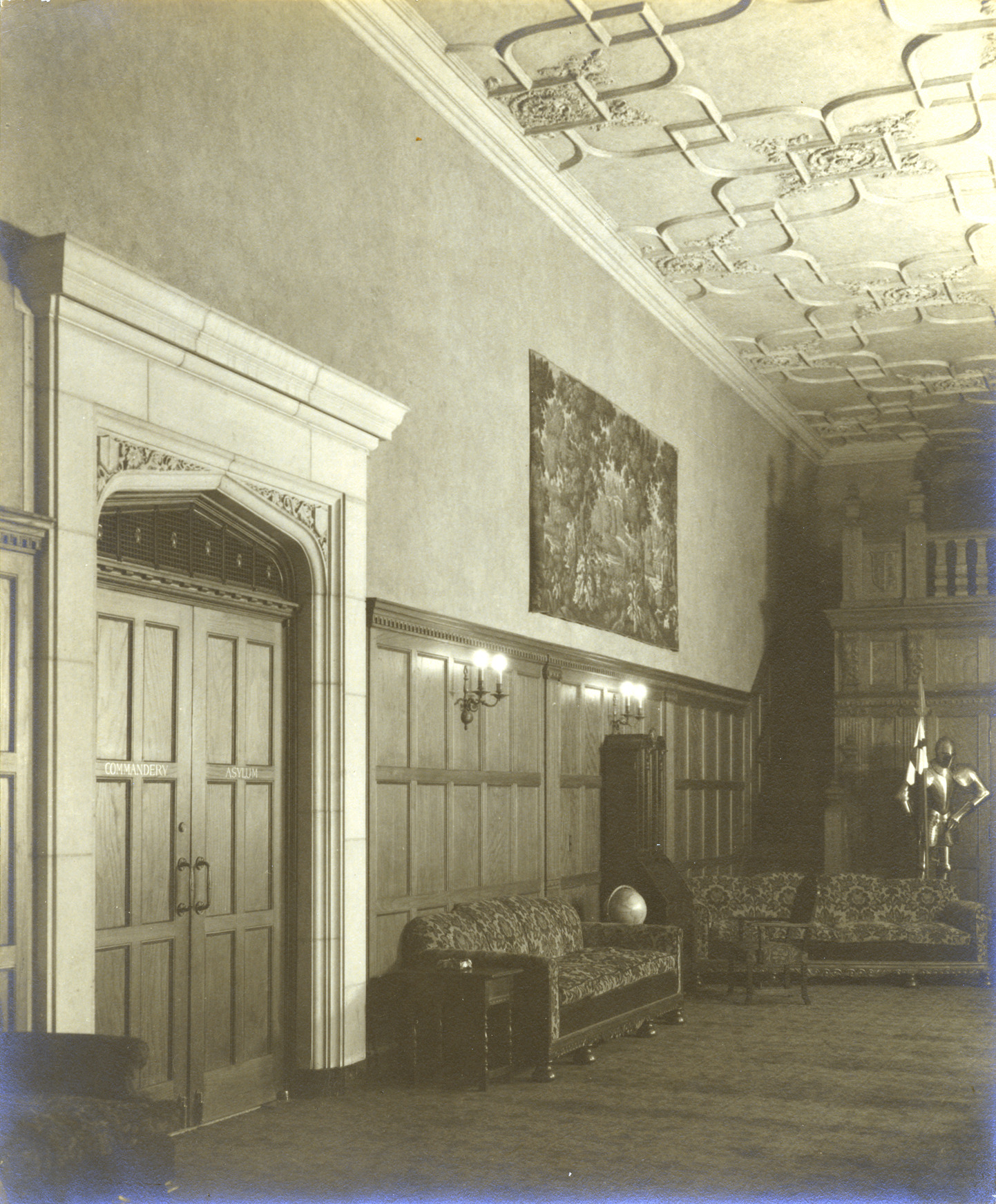 Interior of Masonic Temple. Written on photo back: "Masonic Temple-Commandery Palor Entrance to Asylum."