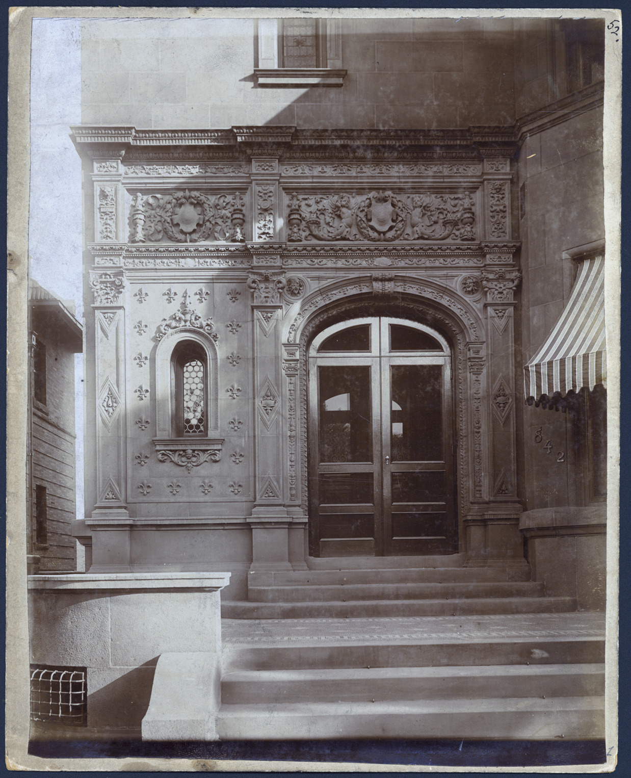 Entrance of the Campau Thompson home showing elaborate stonework in Connecticut brownstone. Written on photo back: "Res. Mrs. A.C. Thompson, Jeff. Ave., Detroit, detail of entrance, 842 E. Jefferson (bet. Chene & Jos. Campau)." Stamped on back: "Office of Mason & Rice, architects."