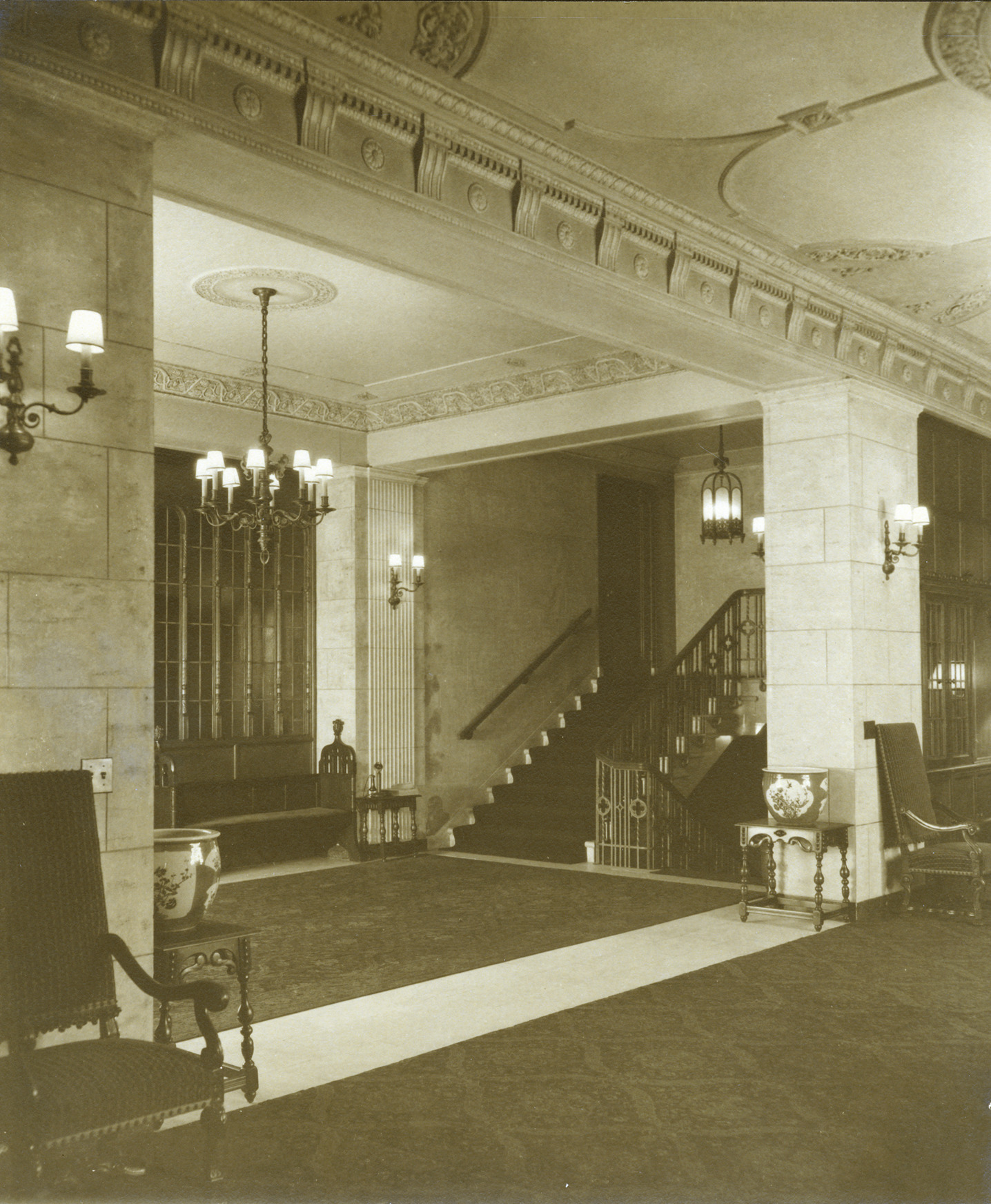 Interior of Masonic Temple. Written on photo back: "Masonic Temple-South End-Shrine Lounge."