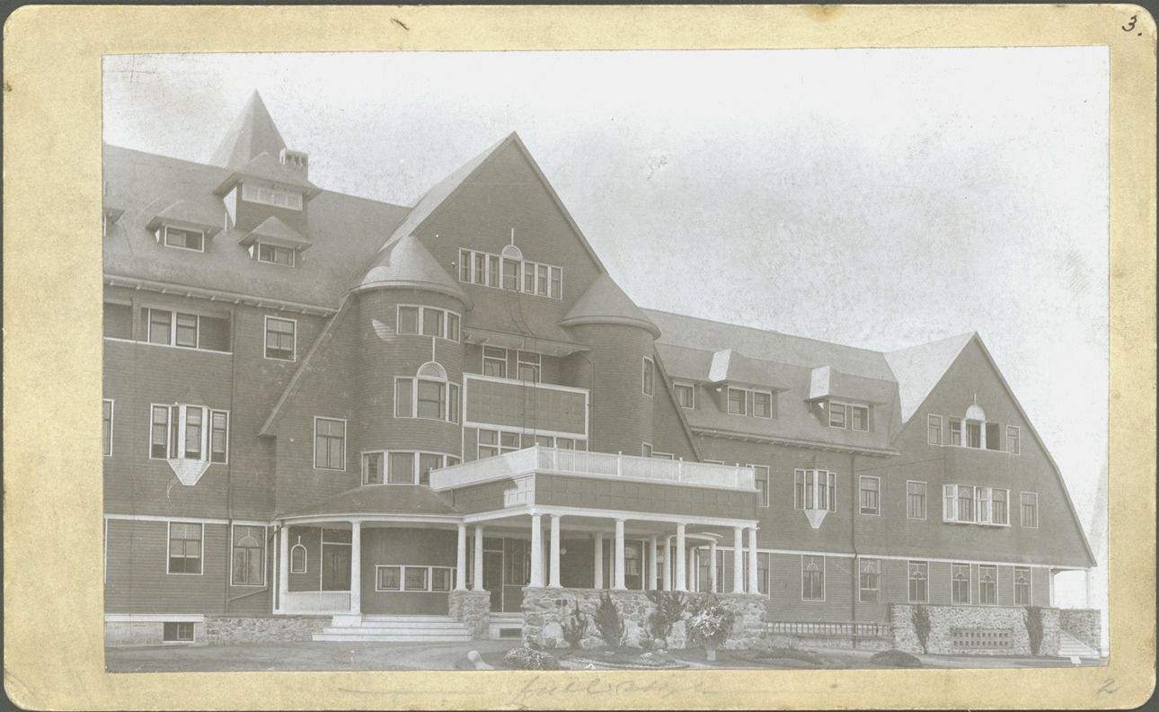 Exterior view of the Mettawas Hotel, including porte-cochere and veranda. Written on photo back: "Mettawas Hotel-North Front." Stamped on photo back: "Office of Mason & Rice, architects."