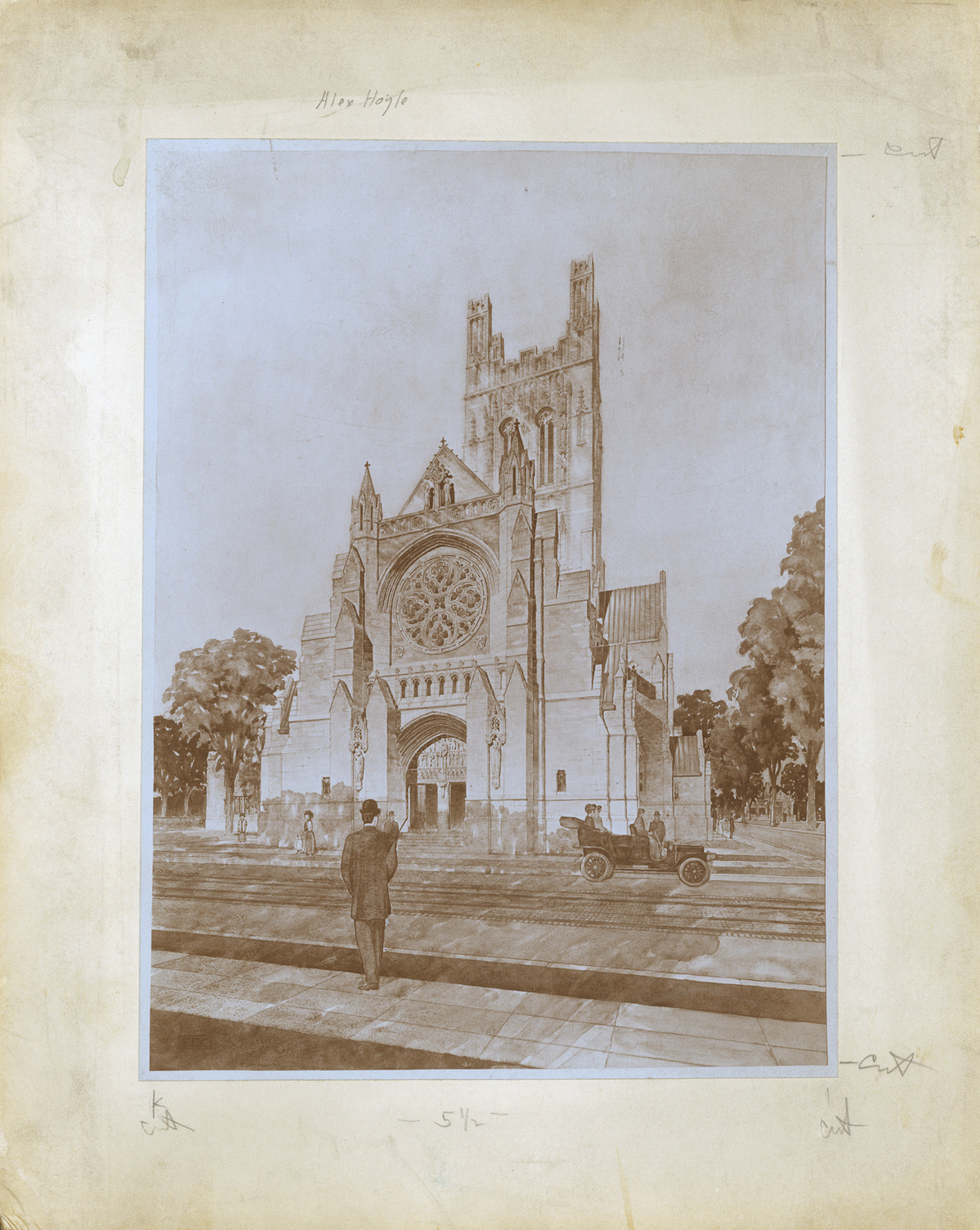 Exterior sketch of front of St. Paul's Episcopal Cathedral with pedestrians and automobile; trolley tracks visible. Written on front: "Alex Hoyle." Pencil sketch of architectural detail on photo back. Written on photo back: "St. Paul's Cathedral (Episcopal)-Woodward & E. Warren-May 20-08,3350-2, 1908."