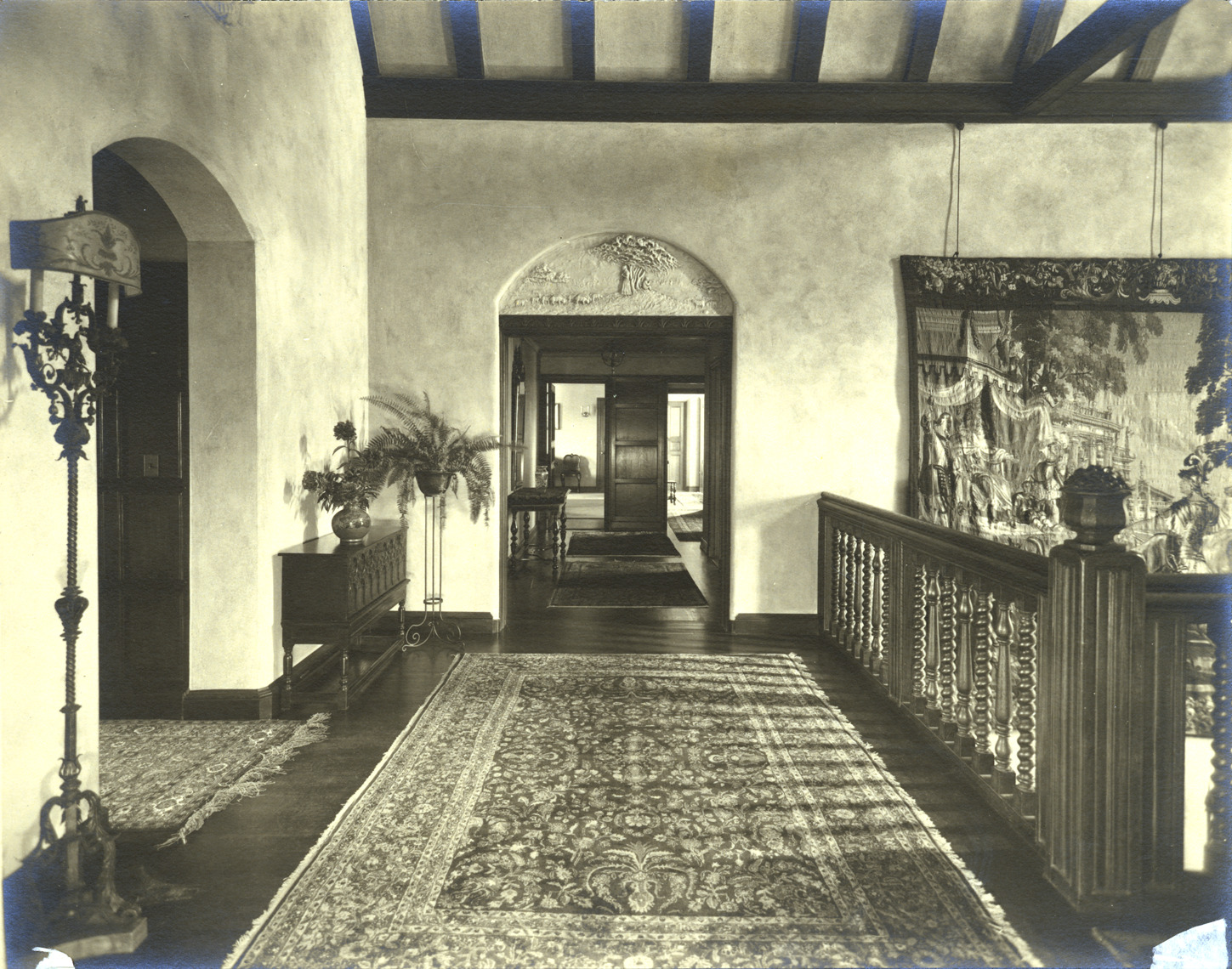 Interior of Edwin S. George residence, second floor balcony with wooden bannister on right. Handwritten on back: "2nd story hall."