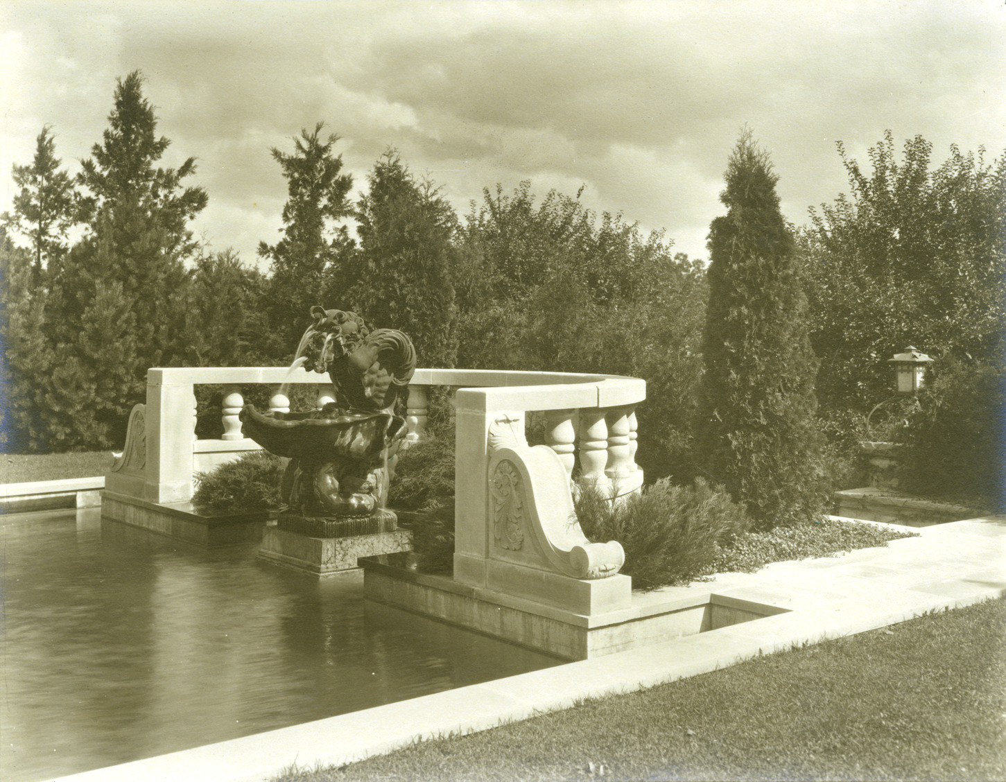 Favorite this☆ Edwin S. George residence Description: Garden of Edwin S. George residence showing gargoyle fountain in pool. Details Resource ID: MR0724 Creator: George D. Mason & Co. Subject: George, Edwin S., 1873-1951--Homes and haunts--Michigan--Bloomfield Hills Fountains--Michigan--Bloomfield Hills Photographic prints Date Issued: 1925 (year approximate) Format: 1 photographic print ; 7.5 x 9.75 in. Member of: Burton Historical Collection Filing Location: D/Architecture-Mason & Rice Colln.-George, Edwin S. Rights: Physical rights are retained by DPL. Copyright is retained in accordance with U.S. copyright laws.