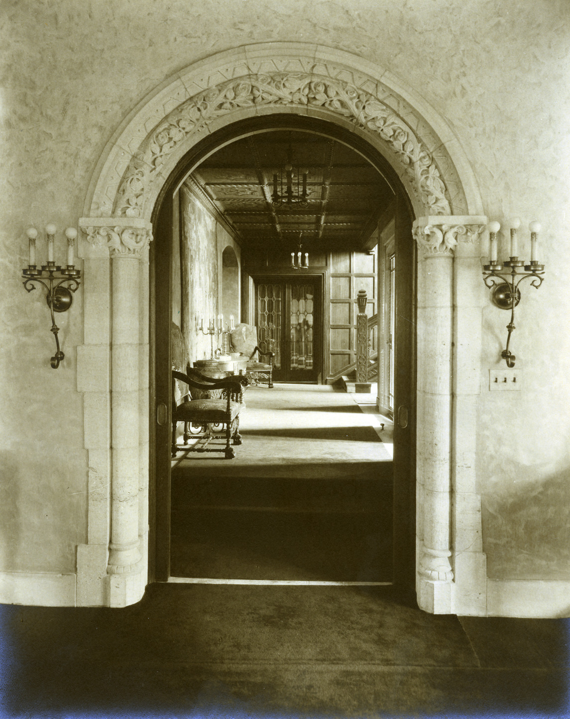 Interior of Edwin S. George residence with view of foyer area through carved marble archway.