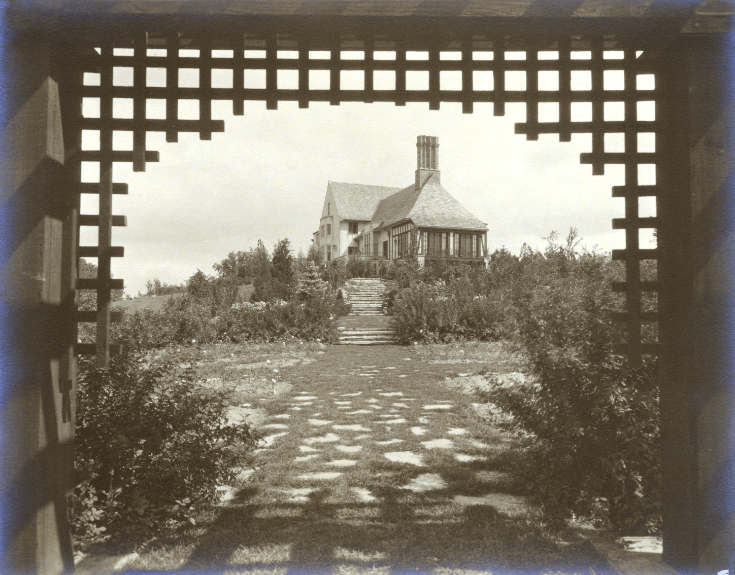 Exterior of Edwin S. George residence viewed from garden through opening in lattice.