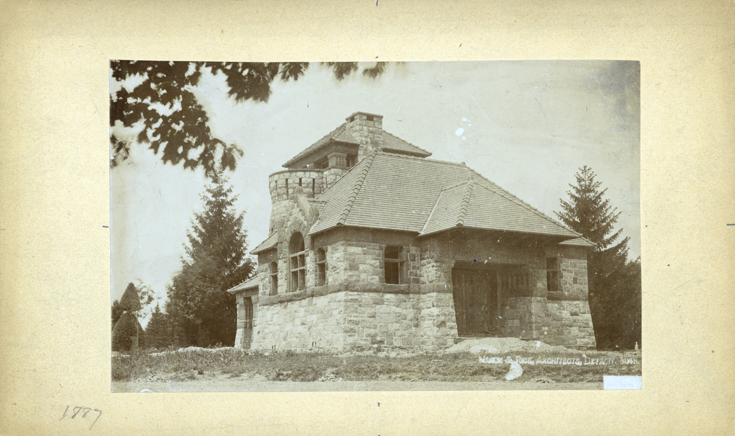 Favorite this☆ Starkweather Memorial Chapel Description: Exterior of Starkweather Memorial. Written on photo front: Mason & Rice Architects, Detroit, Mich." Written on mount front: "1887." Written on photo back: "Starkweather Memorial Chapel-Highland Cemetery-Ypsilanti, Mich.,1887." Details Resource ID: MR0732 Creator: George D. Mason & Co. Subject: Sepulchral chapels--Michigan--Ypsilanti Cemeteries--Michigan--Ypsilanti Albumen prints Photographic prints Date Issued: 1887 Format: 1 photographic print mounted on mat board ; image 4.5 x 7 in. Member of: Burton Historical Collection Filing Location: D/Architecture-Mason & Rice Colln.-Starkweather Memorial Chapel Rights: Physical rights are retained by DPL. Copyright is retained in accordance with U.S. copyright laws.
