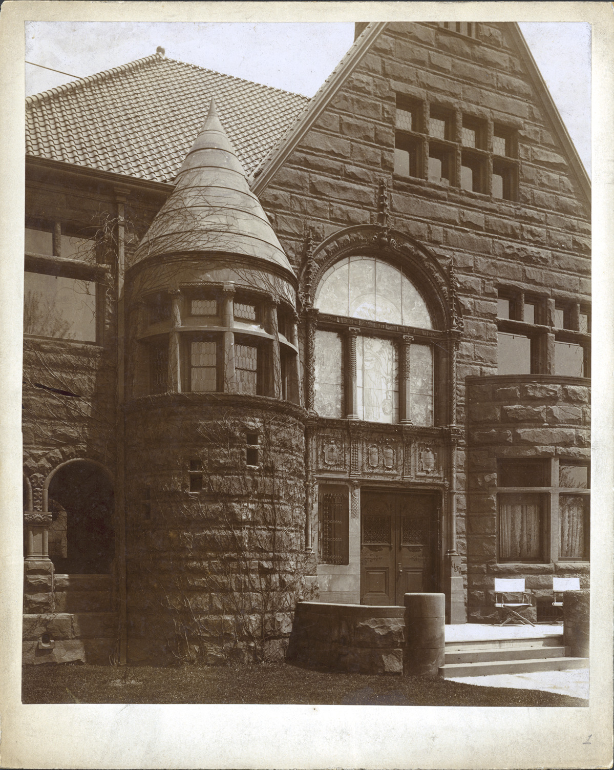 Exterior of the A. L. Stephens Romanesque home on southeast corner of Woodward Ave. and Ferry. Written on photo back: "Stevens Home-Woodward Ave.-Detroit."